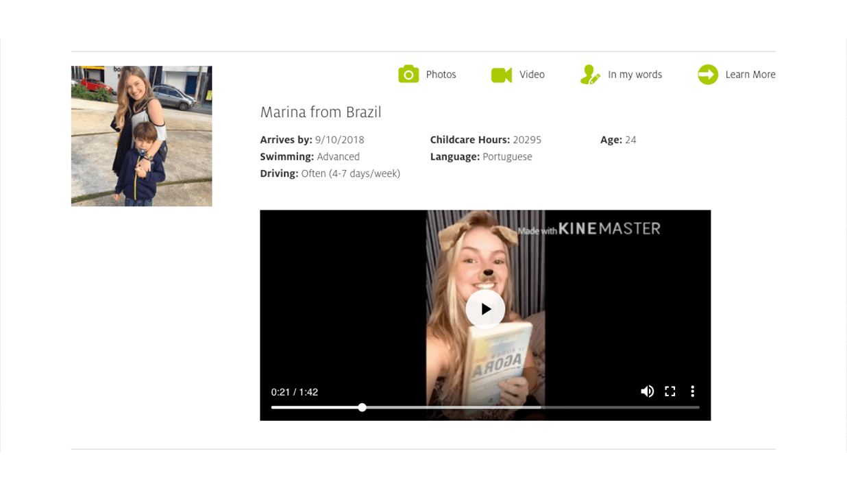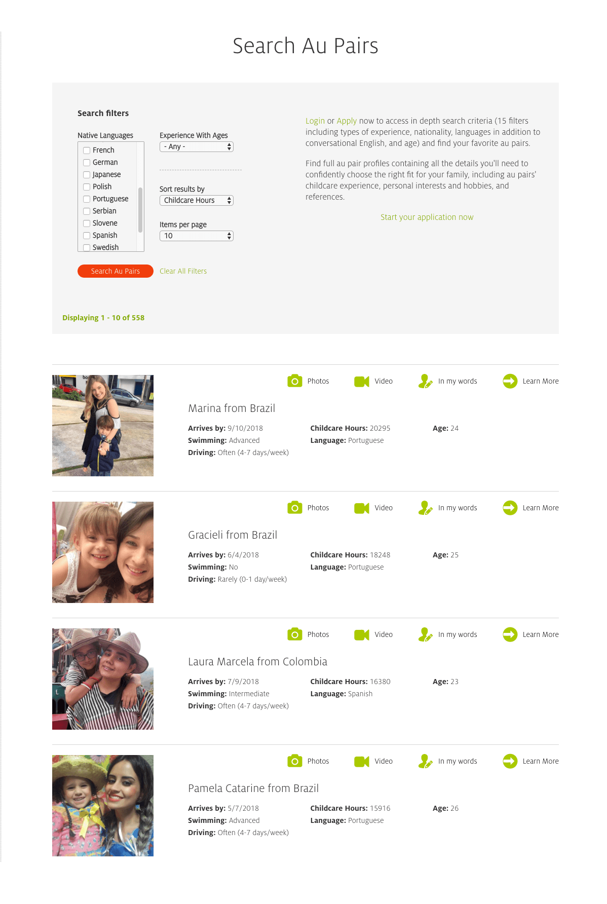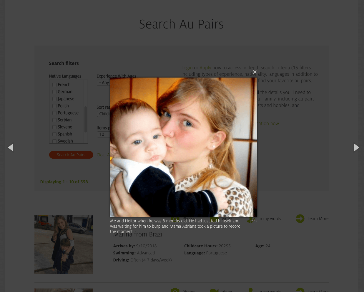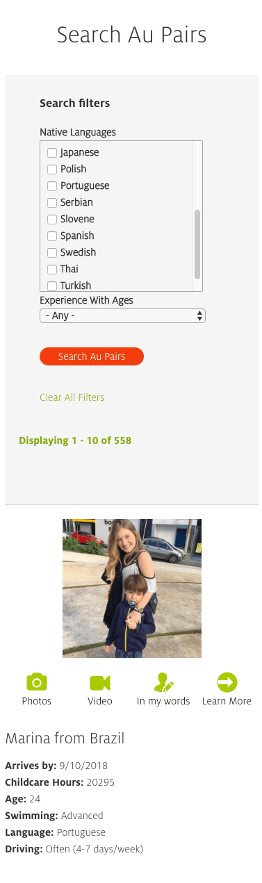 To create an application that displays available au pairs and related images and videos, with custom search filters.
