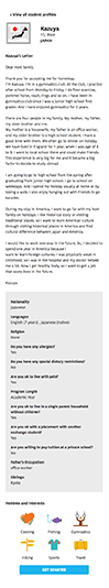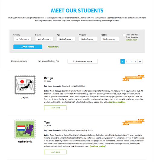 To create a real-time application that displays prospect exchange students with a dinamically-generated page for each student, with different custom search filters and integrated into the website.