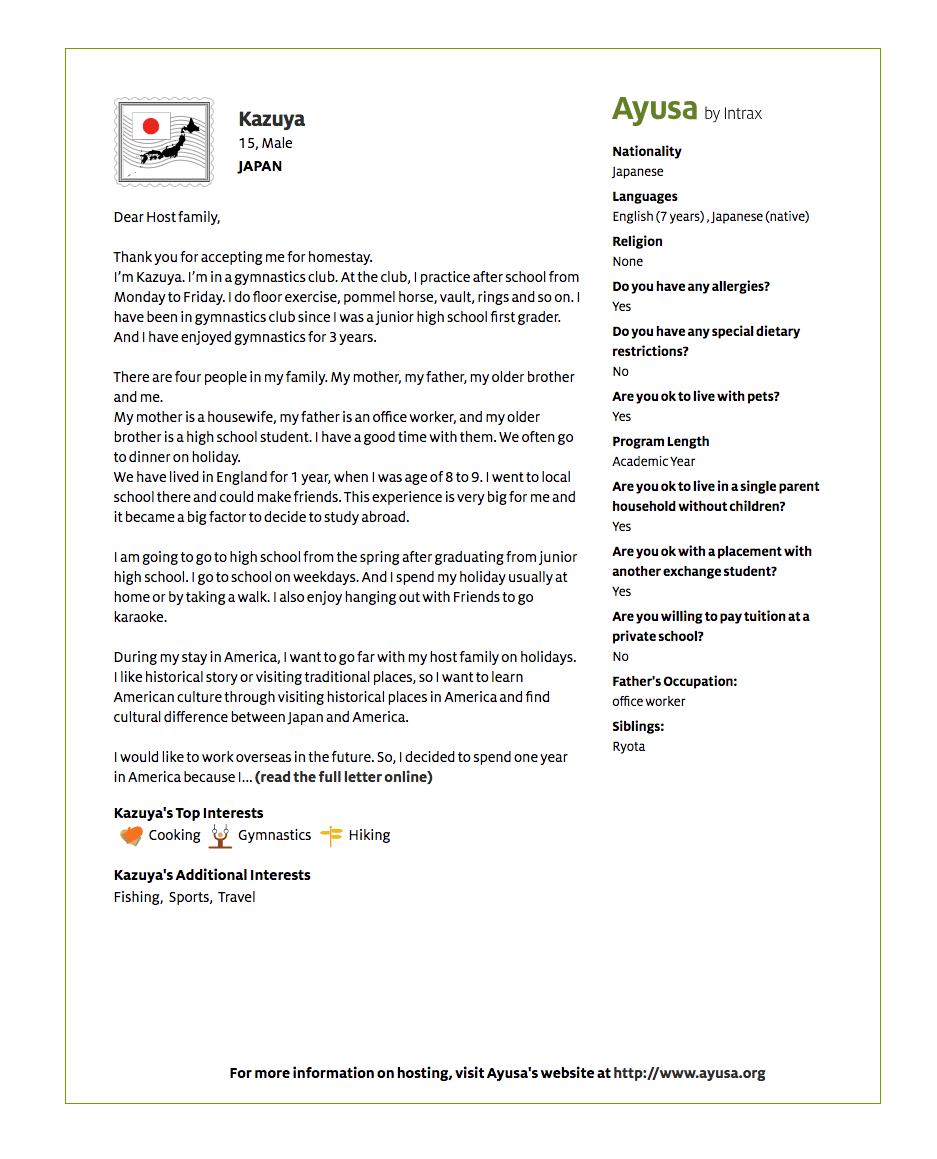 Ayusa is an organization that enables multi-cultural experiences through high school exchange programs.